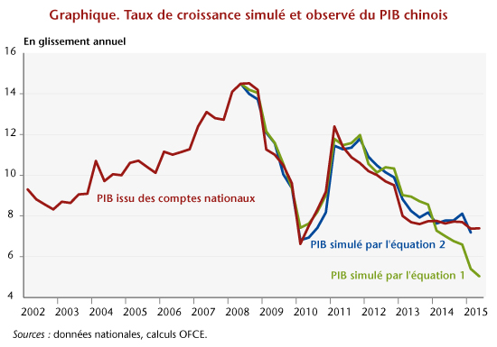 S’inspirant de l’indice Li Keqiang, nous avons estimé le PIB de la Chine à partir de variables de fret et de production d’électricité et de ciment. Si nos résultats confirment le ralentissement de l’économie chinoise depuis 2011, passant d’un rythme en glissement annuel de 12 % à moins de 8 % début 2013, la stabilisation du rythme de croissance observée depuis par les comptes nationaux n’est pas retracée par cette simulation qui indiquerait plutôt la poursuite du ralentissement de la croissance chinoise (graphique 1, équation 1).