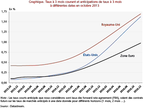 Quelle peut être l’efficacité du forward guidance? Kool et Thornton(2012) expriment de sérieux doutes quant aux résultats obtenus par l’intermédiaire du forward guidance. Ils évaluent la prédictibilité des taux courts et longs dans les pays où cette stratégie a été adoptée et montrent que le forward guidance n’améliore la capacité des agents privés à prévoir les taux courts futurs que pour des horizons de prévisions inférieurs à un an, sans amélioration de la prédictibilité des taux à plus long terme. Le graphique ci-dessous montre ainsi les anticipations de taux à 3 mois par les marchés financiers en octobre 2013 pour les prochains mois. L’évolution minimale des taux directeurs étant de 0,25%, ce graphique nous indique qu’aucune modification des taux n’est pour l’heure anticipée, hormis peut être aux Etats-Unis à l’horizon d’un an.