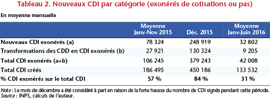 Ainsi, l’engouement pour les CDI a surtout eu lieu en 2015, avant de s’étioler en 2016. L’une des explications en est la suivante : la baisse des cotisations sociales sur les nouvelles embauches en CDI aurait eu un impact plus fort que le Jobs Act lui-même. En effet, les baisses de charges ne concernaient que les contrats conclus sur 2015. Elles ont été reconduites pour 2016, mais de façon beaucoup plus limitée (deux ans contre trois, avec un plafond d’exonération des cotisations sociales divisé par plus de deux), ce qui peut expliquer un moindre engouement. D’ailleurs, on observe un effet d’anticipation pour le mois de décembre 2015 (tableau 2), avec une très forte hausse du nombre de CDI totalement exonérés (leur nombre est multiplié par près de 4 par rapport à la moyenne des onze mois précédents). Au premier semestre 2016, il y a en moyenne 42 000 embauches par mois qui ont bénéficié de cette exonération contributive de deux ans, soit 31 % du total des embauches en CDI[1], contre 128 000 en 2015 (en prenant en compte le mois de décembre). En 2015, les contrats exonérés avaient représenté 61 % du total.