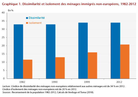 Mesurée au travers de l’indice de dissimilarité, la ségrégation est stable sur la période. Néanmoins, l’indice d’isolement augmente de 11% à 21%. En 2012, l’indice est ainsi trois fois supérieur à la part des immigrés non-européens dans la population qui s’élève à 6,5%. Même si ce niveau n’est pas négligeable, il reste modéré par rapport à celui mesuré aux États-Unis où le niveau d’isolement des immigrés s’élève à 50% tandis que la dissimilarité atteint 44%[7].