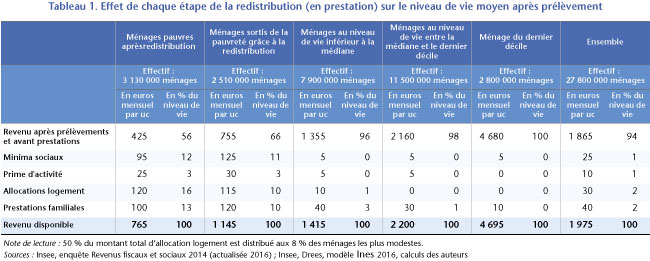 Les minima sociaux bénéficient à 4 millions de personnes, 13,6 millions de personnes vivent dans des ménages percevant une allocation logement, les prestations familiales sont perçues par 6,8 millions de familles et la prime d’activité bénéficie à 2,6 millions de foyers. Compte tenu à la fois des montants distribués et du public visé, les prestations sociales à visée redistributive augmentent le niveau de vie de millions de ménages modestes. A contrario, les prélèvements progressifs comme la taxe d’habitation ou l’impôt sur le revenu amputent le niveau de vie des ménages les plus aisés. Ainsi, la redistribution monétaire réduit massivement la proportion de personnes à très bas revenu (inférieur à 650 euros par mois) (graphique 1).
