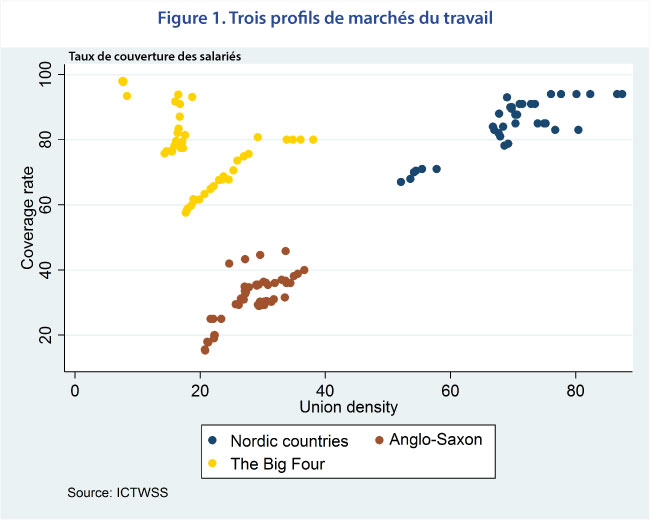 En nous focalisant sur le taux de syndicalisation, le taux de couverture (pourcentage des salariés couverts par des accords collectifs) et l’extension des accords aux acteurs initialement non- signataires, notre analyse permet de dégager trois profils de marchés du travail selon le degré de centralisation des négociations salariales : décentralisé, centralisé et intermédiaire[1]. Comme le montre la figure 1, le premier groupe rassemble les pays anglo-saxons, dont les indicateurs susmentionnés sont faibles. Le second groupe englobe les pays scandinaves, dont les indicateurs sont au contraire élevés. Enfin, le troisième groupe correspond aux pays d’Europe occidentale (France, Allemagne, Espagne et Italie).