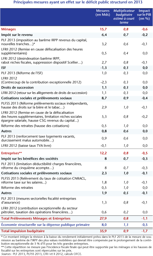 Après avoir détaillé les effets multiplicateurs attendus pour les différents instruments de la politique budgétaire, le multiplicateur budgétaire interne moyen associé à la politique d’austérité menée en France en 2013 serait de 0,9. Cette politique amputerait le PIB de 1,7 % pour cette seule année.Après un effort budgétaire cumulé de 66 milliards d’euros en 2011 et 2012, les économies structurelles attendues pour 2013 représentent environ 36 milliards d’euros (1,8 point de PIB) si l’on intègre à la fois les mesures prises dans le cadre du Projet de loi de finances pour 2013 et les différentes mesures décidées précédemment (tableau). Le choc budgétaire résultant du PLF pour 2013 serait de 28 milliards d’euros, dont 20 uniquement sur les taux de prélèvements obligatoires (PO). Parmi les 8 milliards d’euros restant, près de 5 milliards de hausse de PO sont issus de la seconde Loi de finances rectificative de l’été 2012, le reste étant principalement dû à la première Loi de finances rectificative pour 2012 et à la hausse des cotisations qui résulte de la révision de la réforme des retraites de l’été 2012.