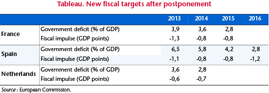 3. Despite the extra time being granted for deficit reduction, fiscal policy will remain very tight: as is indicated in Table 1, the fiscal impulses for France and Spain will still be very negative (-0.8 GDP point per year) as the structural reforms in these countries are being implemented.