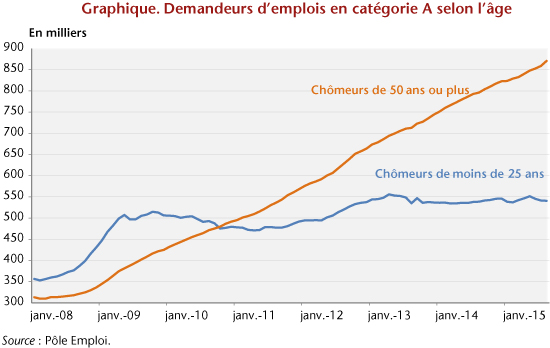 Enfin, si les séniors sont moins souvent au chômage que les jeunes (4,6 % des 50-64 ans contre 8,6 % pour les 15-24 ans), ils sont cependant plus exposés au chômage de longue durée. 62 % des séniors inscrits à Pole Emploi le sont depuis plus d’un an contre 21 % pour les jeunes.