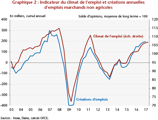 Depuis avril 2017, l’INSEE a complété sa batterie d’indicateurs conjoncturels issus des enquêtes de conjoncture (climats des affaires, indicateurs de retournement) par un indicateur de climat de l’emploi en France. Cette information de nature qualitative, synthétisant par une série unique l’information contenue dans les soldes d’opinions sectoriels sur l’évolution passée et prévue de l’emploi, apparaît très corrélée avec les évolutions annuelles de l’emploi marchand (graphique 2).