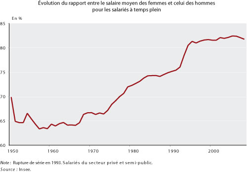 Pourtant, toutes les études qui mesurent les écarts de salaires hommes/femmes montrent la gravité de la situation : un écart de salaires d’environ 25 % en moyenne, dû au temps partiel, à la ségrégation professionnelle (non mixité des métiers et des secteurs) et aux discriminations. Le soupçon pèse sur les femmes d’être avant tout des mères, ou des futures mères, susceptibles aux yeux de l’employeur de quitter temporairement ou définitivement leur emploi (voir les analyses de Dominique Meurs, Ariane Pailhé et Sophie Ponthieux, 2006 et 2010). On constate un coup d’arrêt donné à la résorption des écarts de salaires depuis le milieu des années 1990, pour les salariés à plein temps dans le secteur privé et semi-public (voir graphique).