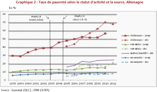 Concernant l’Allemagne, l’analyse du taux de pauvreté par statut d’activité se heurte à des divergences selon les sources, notamment concernant l’évolution de la pauvreté des chômeurs, beaucoup plus marquée selon Eurostat (enquête Eu-Silc) que dans l’enquête nationale SOEP (voir graphique 2). Malgré les incertitudes statistiques, on peut tout de même observer que la pauvreté touche avant tout les chômeurs et que leur taux de pauvreté a beaucoup augmenté : de 30 à 56 % entre 1998 et 2010 selon l’enquête SOEP, généralement considérée comme plus fiable que SILC (Hauser, 2008). Si la pauvreté augmente pour toutes les catégories de population (voir Heyer, 2012), c’est bien chez les chômeurs qu’elle est la plus prononcée.