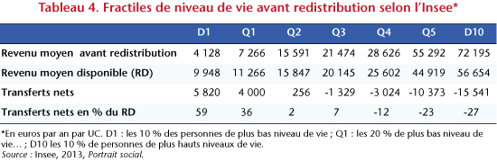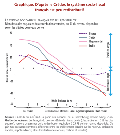 Pourtant, le système socio-fiscal français est considéré, par les institutions internationales, comme figurant parmi ceux qui réduisent le plus les inégalités. Ainsi, l’OCDE (2011) écrivait : « La redistribution par les prestations sociales et impôts réduit les inégalités par un peu plus de 30 % en France, ce qui est bien supérieur à la moyenne des pays de l’OCDE de 25 % ».