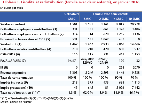 Le système français aide fortement les travailleurs à bas-salaires et leurs familles (tableau 1). Le choix fait a été d’instaurer un salaire minimum relativement élevé en en réduisant le coût pour les employeurs par de fortes exonérations de cotisations sociales patronales. Ainsi, la valeur du travail est reconnue ; ainsi, les travailleurs dits non-qualifiés sont incités à travailler. Par ailleurs, les familles de travailleurs pauvres sont aidées par les prestations familiales, les allocations logement, naguère par le RSA activité, maintenant par la PA. Ainsi, un célibataire au SMIC supporte un prélèvement négatif (-45 euros) si on fait le solde entre les cotisations sociales non-contributives (maladie, famille, etc.) que verse son employeur (314 euros), sa CSG-CRDS (115 euros), ses impôts indirects (218 euros) d’un côté, sa prime d’activité (94 euros), son allocation logement (67 euros) et les exonérations de cotisations employeurs (531 euros) de l’autre. De même, le prélèvement est négatif (-81 euros) pour une famille de deux adultes payés au SMIC, ayant deux enfants à charge.