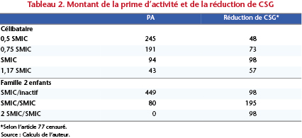 Le choix fait en juillet 2015 a été de renforcer la progressivité du système en remplaçant le RSA activité et la PPE par la Prime d’activité. Comme l’aide aux familles pauvres doit être familialisée et tenir compte de l’ensemble de leurs revenus, elle ne peut pas figurer sur la fiche de paye puisque l’employeur ne connaît pas la situation familiale de ses salariés, leurs autres revenus et que le barème de l’aide souhaitable ne correspond pas à celui de la CSG (tableau 2). Le dispositif mis en place par la PA est beaucoup plus ciblé sur les familles les plus pauvres que ne l’eût été la dégressivité de la CSG. Il est impossible d’aider fortement les familles les plus pauvres par la dégressivité de la CSG car elles en paient très peu. Cette dégressivité ne peut être familialisée et donc elle diminuerait le niveau de vie relatif des familles avec enfants.