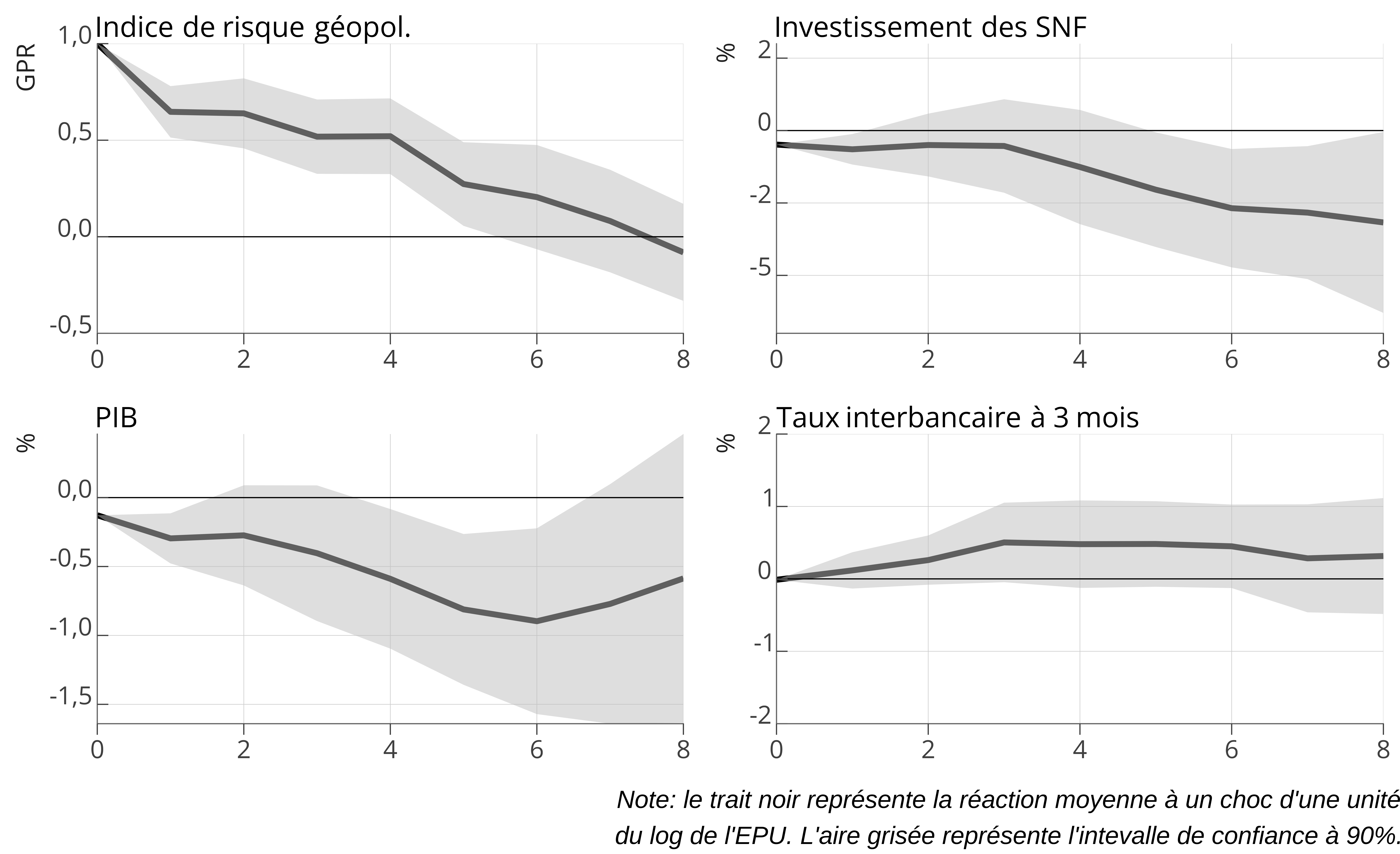 10 Pour information une spécification identique à celle proposée dans Sampognaro (2022) (donc sans variables européennes et avec prix du pétrole endogène) a aussi été estimée (elle-même inspirée de Abiad et Qureshi (2023) pour l’économie américaine). Les effets immédiats du choc d’incertitude sont proches à ceux présentés ici, mais leurs effets se dissipent plus rapidement pour des raisons qui seront mentionnés dans la prochaine sous-section.