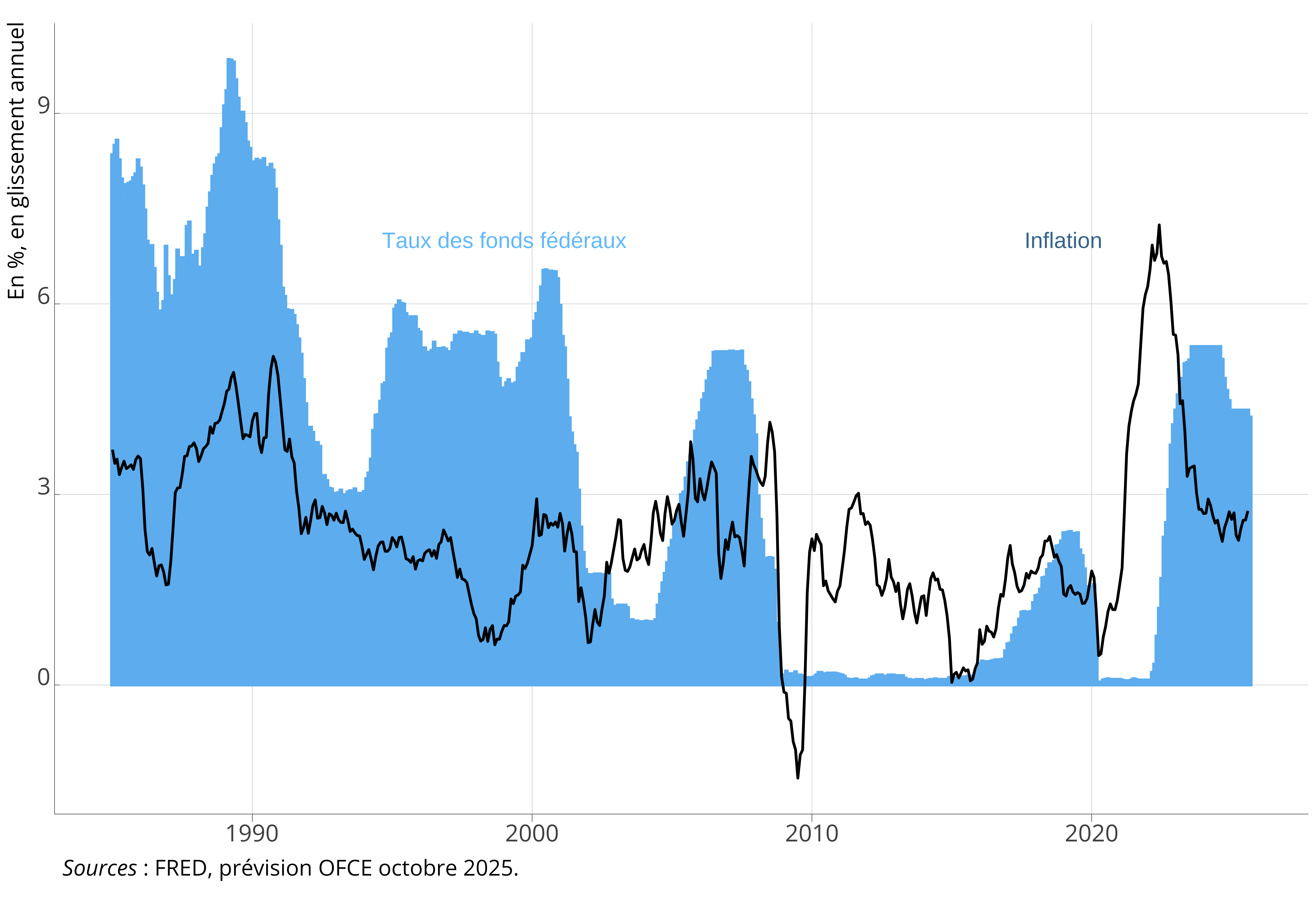 Aux États-Unis, l’enquête réalisée par la Réserve fédérale de Philadelphie auprès des prévisionnistes (Survey of Professional Forecasters, SPF) montre un déplacement marqué de la distribution des anticipations pour 2026 entre l’enquête réalisée au quatrième trimestre 2024 et celle du troisième trimestre 2025. La probabilité associée à des niveaux d’inflation supérieurs à 3 % s’est accrue de manière notable, traduisant une perception plus forte des risques inflationnistes. Cette révision à la hausse peut refléter plusieurs facteurs anticipés par les professionnels : hausse des droits de douane et impact de la guerre commerciale sur biens importés, expansion budgétaire ainsi que les incertitudes entourant l’orientation de la politique monétaire, voire l’indépendance de la Réserve fédérale.